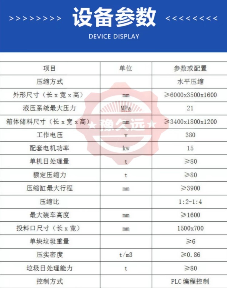 ◇全封閉水平壓縮:采用水平壓縮方式,垃圾壓縮密度≥0.86t/m3,垃圾壓縮后體積大大減小,從而大幅度提高轉運車輛裝載量