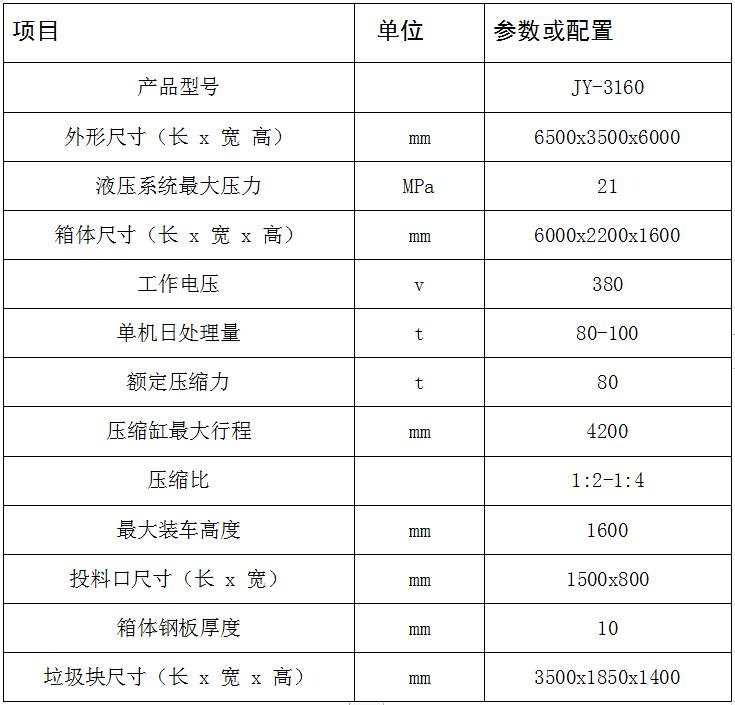JY-3160 水平式四柱舉升垃圾壓縮設備用于對城鎮居民生活區、學校、醫院、公園景區、廠礦和機關單位的生活垃圾以及固體廢棄物的收集、壓縮減容和封閉轉運。