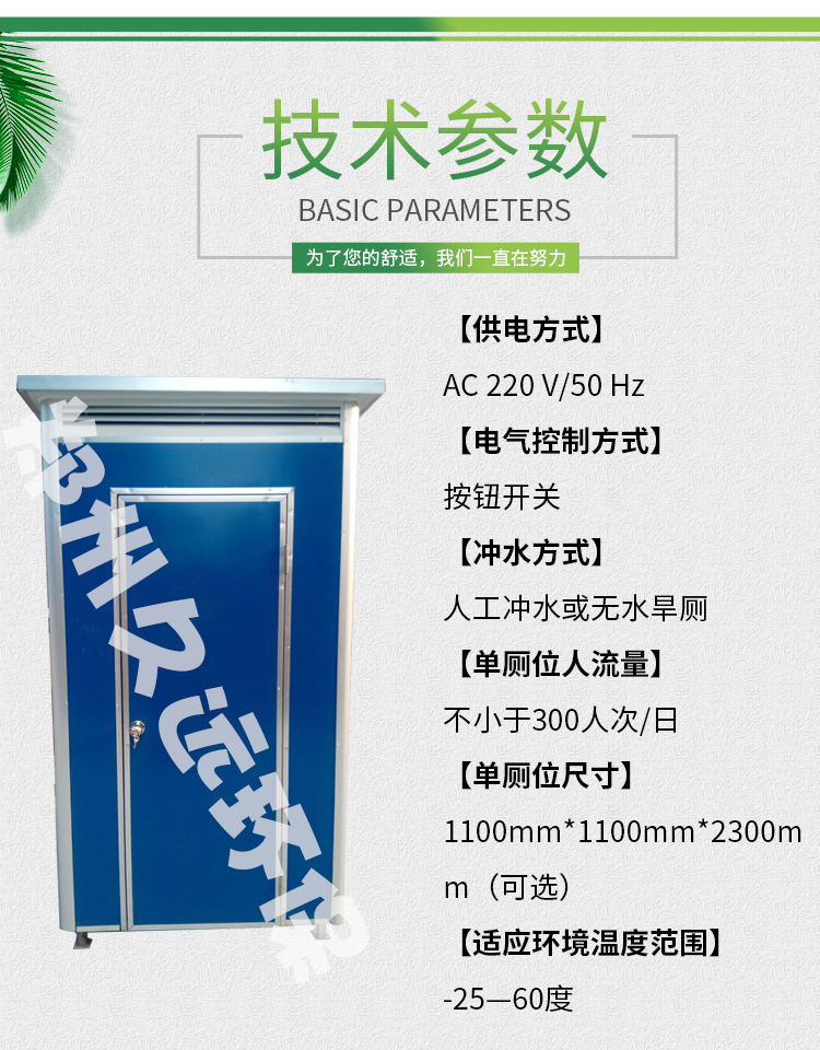 移動廁所不受任何工作環(huán)境的限制,外形結(jié)構(gòu)輕巧,顏色搭配合理。 適用于城市街道、旅游景點(diǎn)、建筑工地、公園綠化、生活小區(qū)、車站、碼頭、廣場等人口密集的公共場所及繁華商業(yè)街等場所。 移動洗手間具有可移動性、方便運(yùn)輸、安裝簡單等優(yōu)點(diǎn)。 移動廁所水沖式內(nèi)部配置: 蹲便器、沖水箱、洗手池、排風(fēng)扇、照明開關(guān)、門鎖 ...